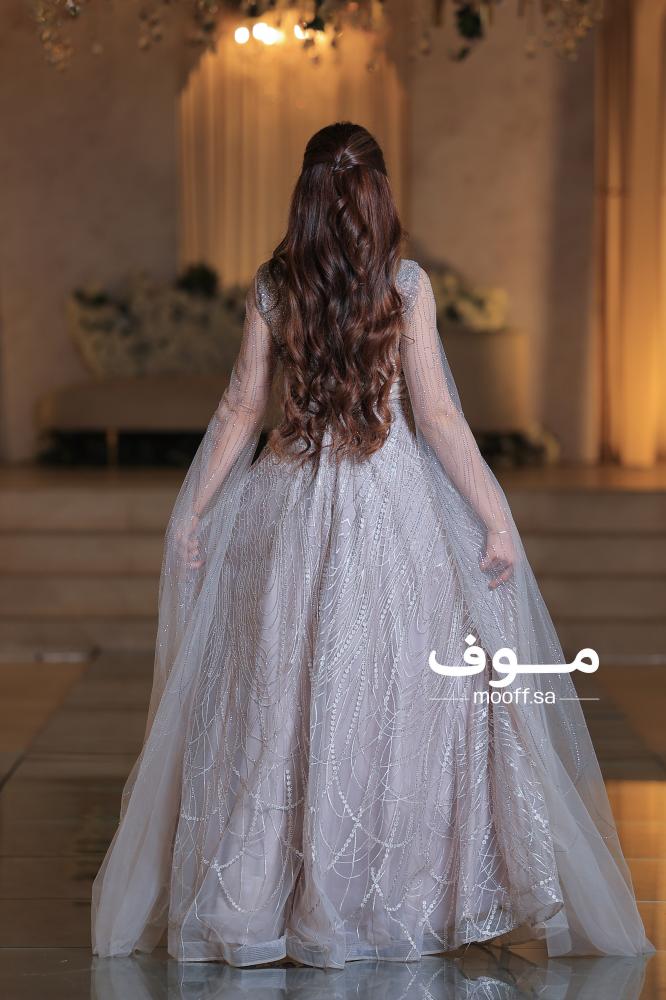 • أكمام طويلة شفافة تنسدل منها طبقة من التول المطرز، تضيف لمسة درامية راقية تفيض أنوثة.